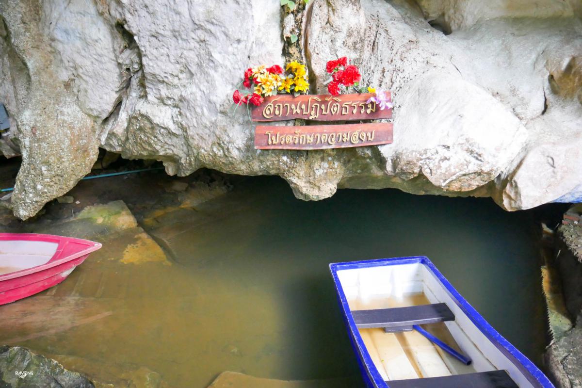 จากการสำรวจสัมผัสได้ถึงบรรยากาศที่เงียบสงบ มีความสดชื่น มันจะเย็นๆ ชื้นๆ หน่อย ด้านหน้าจะมีพระพุทธรูปขนาดใหญ่ ส่วนด้านข้างจะมีถ้ำเล็กๆ ที่ประดิษฐานพระพุทธรูปอีกหลายองค์ให้ประชาชนได้สักการะขอพร ถัดมาจะเป็นอุโมงค์บาดาลที่เชื่อมต่อไปยังอีกฝั่งซึ่งเราต้องนั่งเรือเข้าไป งานนี้ถ้าพายเองคงล่มแน่ๆ โชคดีที่วันนี้มีน้องเป้งอาสาพาเข้าไปชมความสวยงามด้านใน โดยน้องเป้งไม่ได้นั่งพายเรืออย่างที่คิดไว้ แต่ใช้วิธีการไสหรือดันเรือเข้าไป เพราะน้ำไม่ลึกมากแค่ระดับอกน้องเป้งเอ๊ง! น้ำนี่อย่างเย็นเล่นเอาคนไสเรือเราตัวสั่นเลยทีเดียว ระหว่างทางที่เข้าไปในอุโมงค์จะเห็นหินธรรมชาติที่ถูกกัดกร่อนมีรูพรุนเล็กใหญ่สลับกันไป เนื่องจากระดับน้ำสูงไม่มากแม้…ฉันกลัวที่แคบ ก็สามารถลุยต่อได้สบาย แต่บางช่วงต้องยอมก้มหัวให้หินนิดนึง ไม่งั้นเดี๋ยวโป๊กขึ้นมาละแย่เลย มีคนเล่าว่าอุโมงค์นี้พระ เณร เด็กวัดและชาวบ้านต้องช่วยกันขุดและขนดินออก กว่าจะทะลุถึงถ้ำอีกฝั่งหนึ่งได้ต้องใช้ความพยายามอย่างมากมาย ล่องเรืออยู่ไม่นานน่าจะระยะทางเกือบ 300 เมตร ก็มาถึงฝั่งด้านใน ซึ่งมีลักษณ์เป็นหุบผา มีลานกว้างมองเห็นต้นไม้และท้องฟ้า ซึ่งมีการปรับพื้นที่ให้ดูสะอาด กลมกลืนกับธรรมชาติ ด้านในจะมีถ้ำเล็กๆ ที่ใช้สำหรับใช้ปฏิบัติธรรม รู้สึกว้าว! ทันทีเมื่อได้มายืนมองถ้ำ เพราะเต็มไปด้วยหินง้อยหินยอก เอ้ย! หินงอกหินย้อย และอากาศไม่อับชื้นมาก มีค้างคาวบินมาทักทายนิดหน่อยนับได้ 4 – 5 ตัว ในถ้ำทางวัดจะติดไฟไว้ระหว่างทางซึ่งเราสามารถมองด้วยตาเปล่าโดยไม่ต้องพึ่งไฟฉาย ที่นี่อากาศดีเย็นสบาย โดยเฉพาะหุบฝาที่มีความเขียวขจีของต้นไม้สลับกับหินที่ดูสบายตา กลับมาที่ด้านนอกยังมีลิงและบ่อเลี้ยงปลาให้ได้ชมกันอีกด้วย