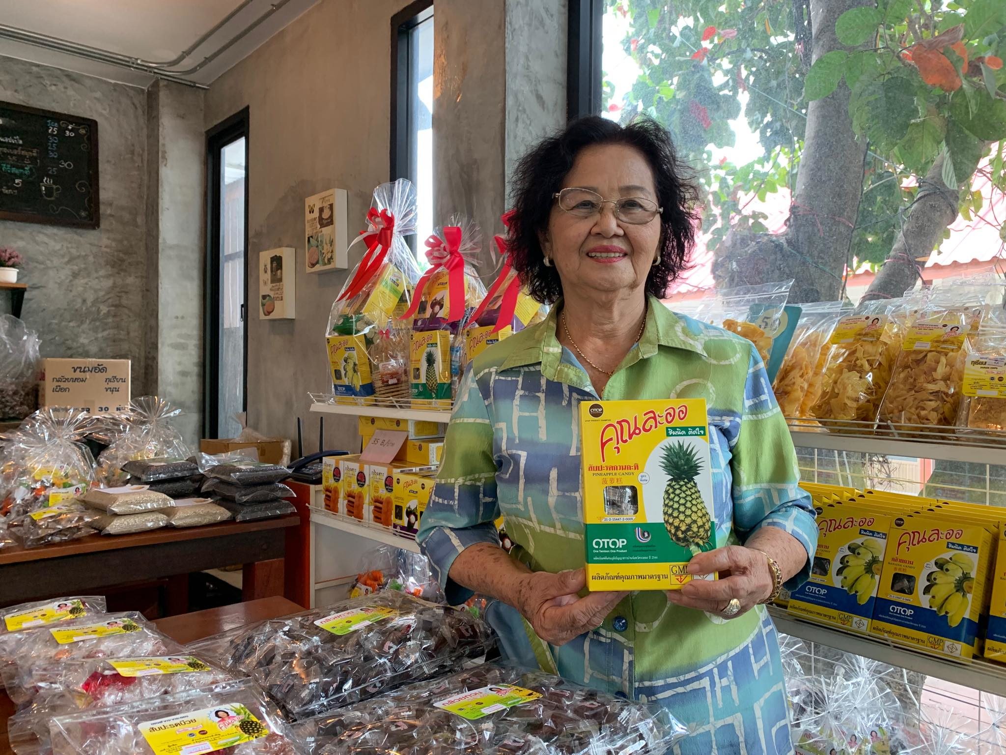 คุณละออ สุวรรณสว่าง อายุ 75 ปี หรือ ป้าอวย ประธานกลุ่มผลไม้แปรรูปบ้านหนองละลอก อำเภอบ้านค่าย จังหวัดระยอง และเจ้าของแบรนด์ผลไม้แปรรูป “แบรนด์คุณละออ” สินค้าโอท็อป 5 ดาว ที่คนระยองรู้จักกันเป็นอย่างดี